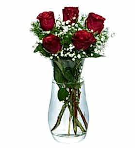 Cam vazoda beyaz cipsolarla süslenmiş 5 adet kırmızı gül.