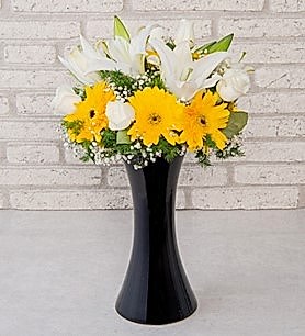 Çiçek göndermek en samimi hislerin dışavurumudur. Seviyorum, özledim, iyi ki varsın gibi dilekleri içlerinde barındırırlar. Tüm dileklerinizi iletebilecek bir çiçek aranjmanı arıyorsanız, sizin için önerebileceğimiz etkileyici bir çiçek buketi önerisi var: Beyaz ve Sarı Gerbera, Lilyum ve Güller. Mis kokulu beyaz lilyumlar enerjik sarı gerberalar ile bir araya geldi. Beyaz renkli cipsolar ve beyaz güller ile tamamlandı. Siyah şık ve modern bir vazo içerisinde hazırlanan bu çiçek aranjmanı ile sevdiklerinize hoş bir sürpriz yapabilirsiniz.
