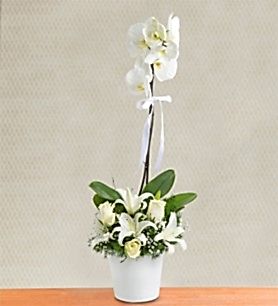 Mutluluğun en güzeline layık sevdiklerinize unutulmaz bir sürpriz yapın. Seramik saksı içerisinde tek dal orkide, beyaz lilyum ve güller ile hazırlanmış Su Perisi Orkide Lilyum ve Gül Aranjmanı, sevdiklerinizi kocaman gülümsetecek.